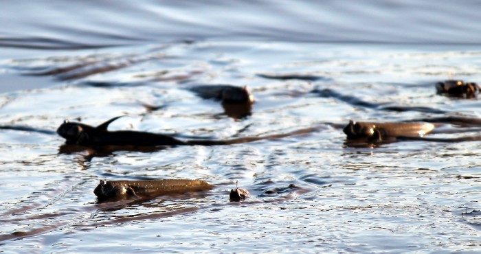 17:00 釣りしたり自転車の練習をしたりしていたが,潮もだいぶ引いてきたので,帰ることにする。ムスメの自転車の練習中ふと川を見てみるとだいぶ干上がっており,蟹なども活発に動いている。干潟状の所と水があるところの際を見てみると,鰻のような個体が頭だけを出し泳いでいるので,ムスメと観察していたところ,同じような個体がウジャウジャいることに気付く。自転車に乗れるようになったムスメに指令を出し,一眼レフを車まで取りに行かせる。しかし,自力発進できないので,途中で止まり,結局,走って取りに行くことになる(笑)。