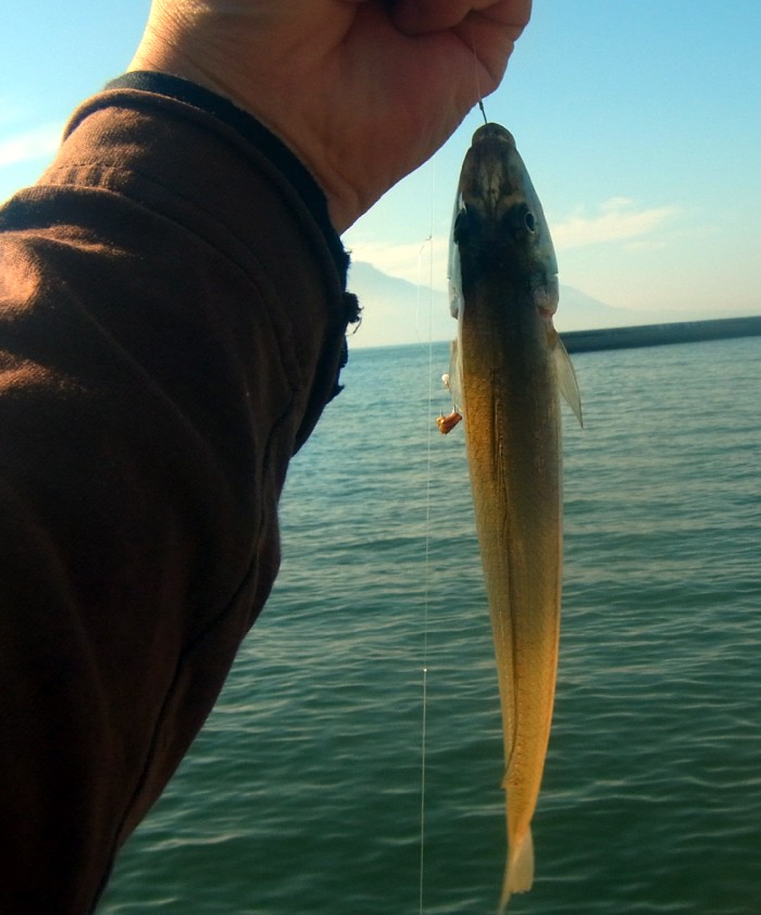 15:30 活性が無くなり暇になる。齢70過ぎの男性が先端部でボラの引っかけ釣りを始める。あり得ないくらいの大きさの掛けバリで本当に釣れるのかと思いきや,僅か20分余りでボラを2匹あげていた。気温も高く暑いので上着を脱ぐ。ふと,内派止の沖目をみると,なんとスナメリまでいる始末。よくこの時期に見かけるタコ釣りのおじさんによると,冬場になると港内にも入ってくるとのこと。