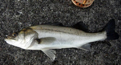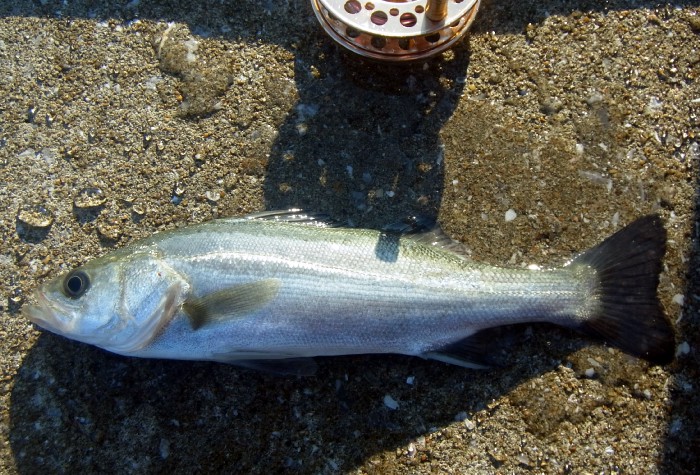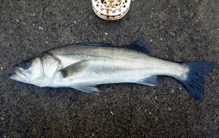 15:00 先端部に到着。大潮の引き潮なのでかなり潮流が速い。やや前打ち気味に琵琶湖海老を流すと,ひったくりの大きなアタリがあり。合わせるも空振り。どうもセイゴの群れが目前にいると確信し,琵琶湖海老の大型を装着して同じところに流すと糸を引きこむアタリがあり即合わせを入れるとHIT。抜群の引き込みを見せしばらくやり取りするとやはりそれなりの型が見えてきた。タモを入れるもややもたつき何とか回収。魚はタモに入れたままで再び同じ場所に餌を流すと直線的な引きがありまた即合わせ。同じレベルのセイゴがHITしたが,タモを投入しようとするとタモの下栓が落下し海に落ちる。タモが使用できなくなったので,無理やりブリあげて何とか確保した。