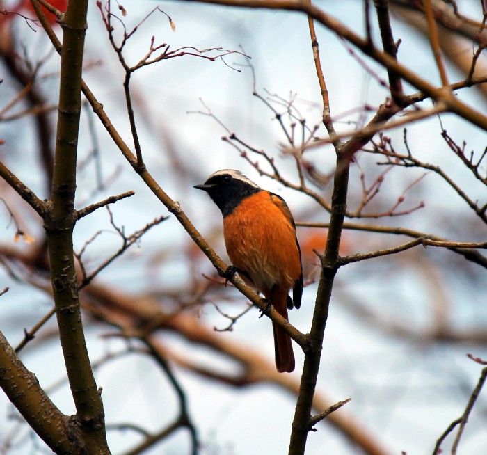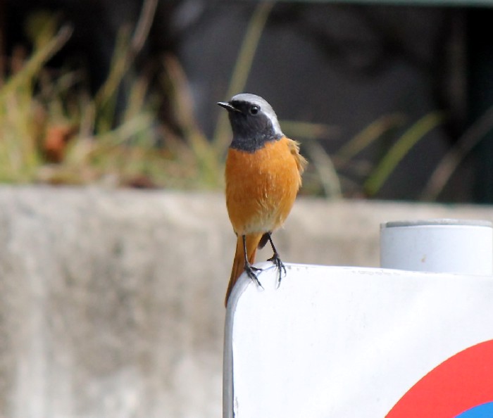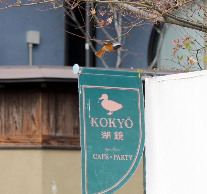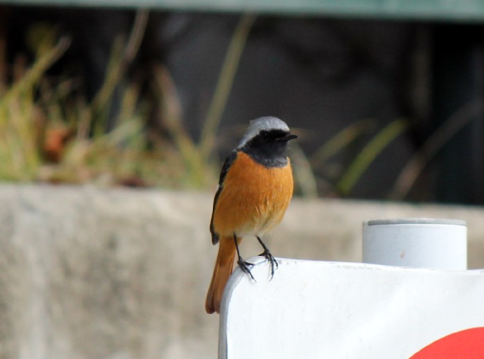 あと1秒早くシャッターを切っていればジョウビタキが看板の上に静止していた。