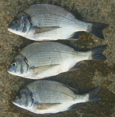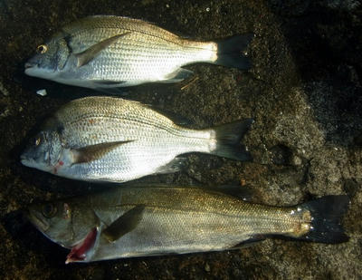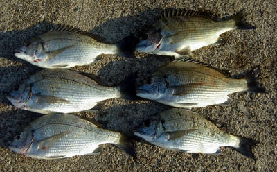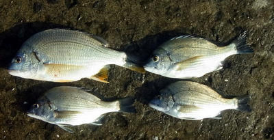 16:50 蟹も尽きたので納竿とする。本日の釣果は黒鯛10匹/キビレ2匹。蟹も20匹以上潰されバラシも多かったので,針そのものや餌の付け方等の工夫をしなければならない。キープしていた魚を処理して帰路に着く。