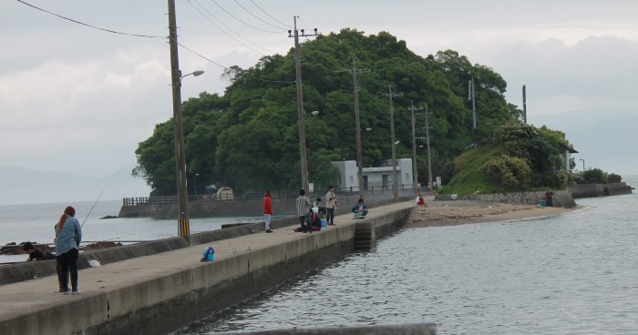14:50 最初の波止に到着。お目当ての場所は砂の運搬船が停泊しており,しかもファミリーが入っているので,初めて波止側で試してみる。ムスコに釣り方の説明のために試しているといきなりセイゴがHIT。しかし,あまり釣れない。水深も浅くとても良い場所ではないのか,連休なのか釣り人が多かった。