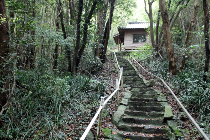 標高は140mほど。しかし,かなりの急斜面の模様。最初は石段があるが,手作りのためか,高さが一定でないので,登りにくい。ムスコが生物を発見する。
