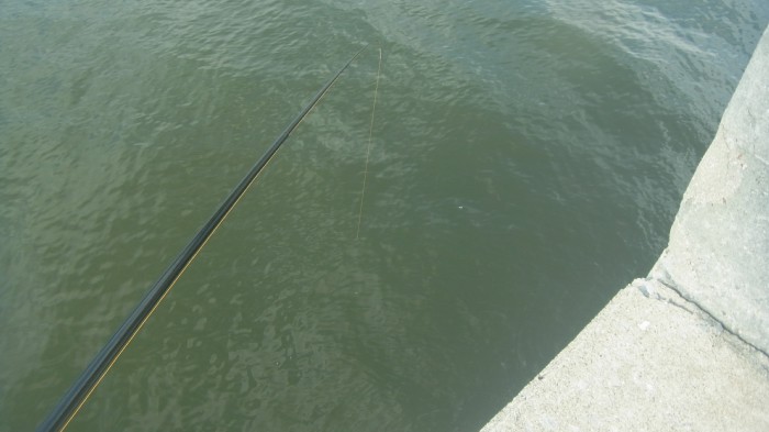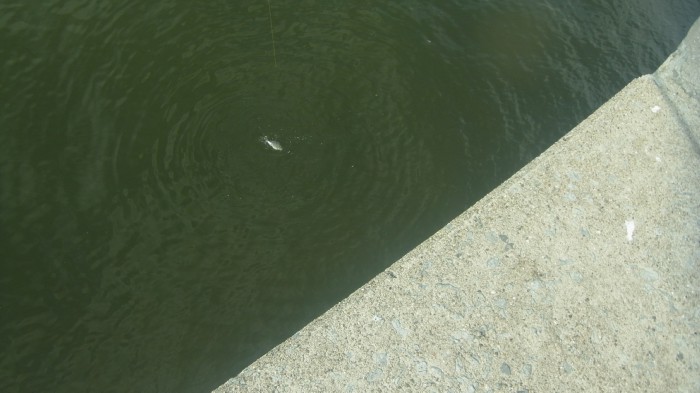14:10 どうも活性が上がり,小型も含め黒鯛が次々と上がる。しばらくすると,大物がHIT。最初は凄まじき引きだが,すぐにやる気を無くす。糸を巻いてみると,大型のボラ。偶にやる気を出して引きこんだりするが,基本的にやる気がない。しょうがないので落としタモを投入するも,暖簾に腕押し状態で,数分間やりとりをする。最期は落とし打もに入る寸前で,口から針が外れ事なきを得るも,魚は散ってしまう。