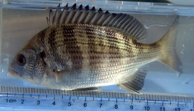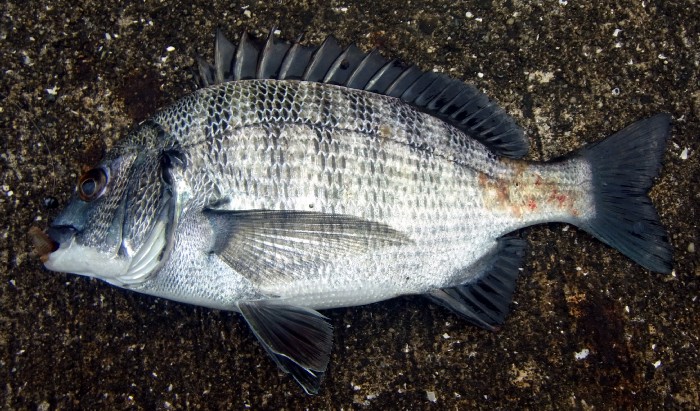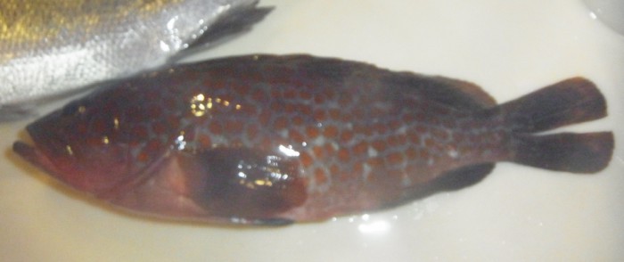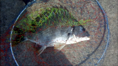 見ての通り奇形個体。正常ならば,40㎝overだっただろう。かなり体高があり,旨そうであるが,魚屋の父親からどんな魚でも大型個体(老齢個体)はあまり旨くないと教えられているので,とても食べる気にならなかった。各鰭に出血も見られないので,生きていけると思い,撮影後放流する。