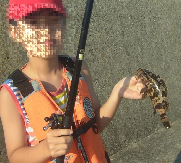 7:15 ムスコの仕掛けをセットし,釣り開始。ムスコは安全な内波止を探らせてカサゴ狙い。私は外波止で黒鯛狙いでへちる。先端に近い方で,ウキ釣りのおじさんが40㎝クラスの黒鯛を上げる。ムスコの方は,激安バスロッド+カサゴ用の胴突き仕掛けで,へちを探らせると小型のカサゴが釣れてくる。しかし,餌の青虫君を付けることが出来ないので,いちいち面倒を見なければならないが,かなり魚影が濃いので,ムスコも楽しそうであった。