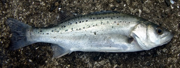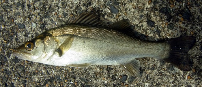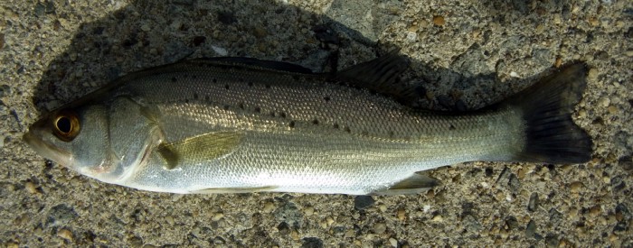 体に斑点があるので,有明海産スズキかもしれないが,背鰭の確認をしていなかったので,確定できない。簡単に3匹ほど続けて釣れたので,もう少し大きいのが釣れるはずと信じてリリースしたが,失敗した。また内波止にもどり,波止の奥側をへちると,いつもと同じような釣果だった。