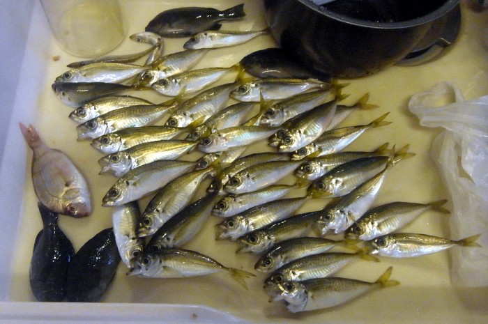 11:30 雨が降ったりやんだりだが,アジのアタリも遠のいたので納竿。本日の釣果はアジ約40匹/メジナ約30匹/マダイ約5匹/草河豚約5匹/ギンイソイワシ約5匹/カタクチイワシ1匹/カマス1匹/キタマクラ1匹/イサキ1匹。キタマクラなど初めての魚も釣れたが,写真を撮る余裕も無かった。
