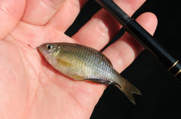 16:15 最初のポイントに到着。初めて叩く場所。雰囲気は良さそうだが,鯉しかいない。完全に沈黙だが,上流下流でたなごは確認しているので,時期が合えば釣れるのだろう。イチモロコとタイバラが(爆)。