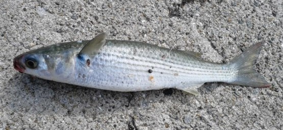 10:30 ダゴチン釣りをしているおじさんが大物をHIT。80㎝クラスのボラだったが,タモ入れを手伝う。ダゴチンもまだ釣れていない模様。ゴンズイばかりだそうだ。
