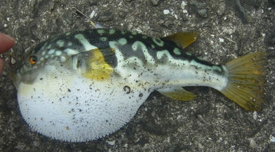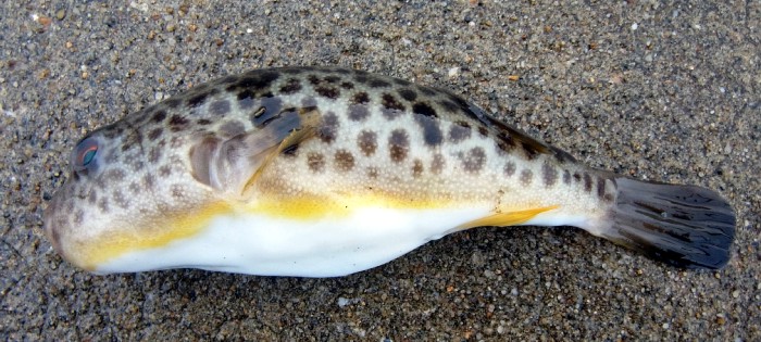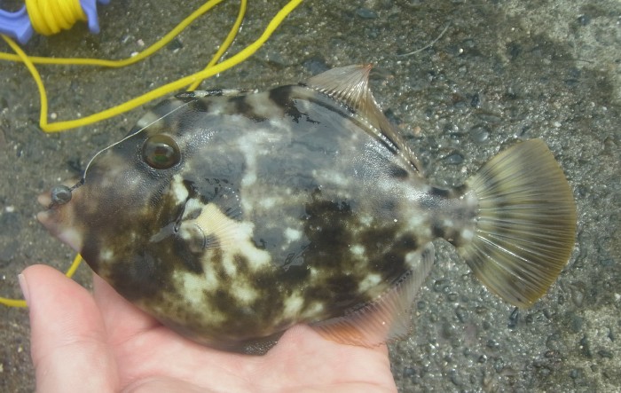 顔はコモンフグのようだが,背中から後ろの模様が何か違う。河豚も混血化するのだろうか?