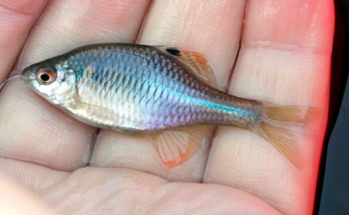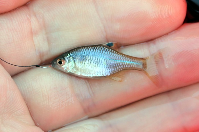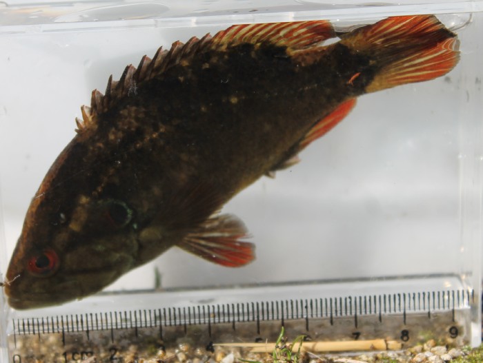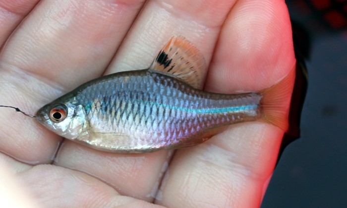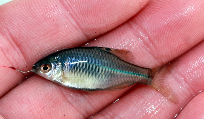 私:「ここのは放流個体です。それに,見てください。小型の個体もたくさんいます。しっかり繁殖して,数を増やしています。採集して持ち帰る人も多いですが,ここ数年の話です。あなたが子供のころから,ここにミツクリセイベイはいましたか?そんな数十年前からここでミツクリセイベイを釣る人がいましたか?。むかしからミツクリセイベイはいないはずです。あなたがこの魚の存在を知ったのも数年前ではないのですか?」