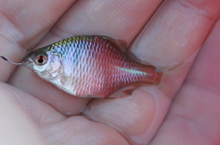 何となく秋を感じる。こいつも良く引く。食べても旨そうだが,やはり毒々しいので,リリースする。しかし,続けて3匹程釣れ,もういいと言う感じになる。
