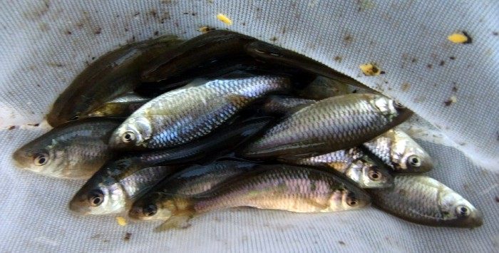 私:「ここも前はたなごがいましたが,イチモロコと大陸薔薇のみです。両者とも移入種です。確かにめっきり姿を見なくなりましたが,それはミツクリセイベイが増えていることも影響しています。」