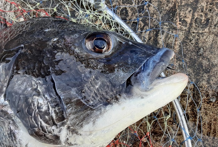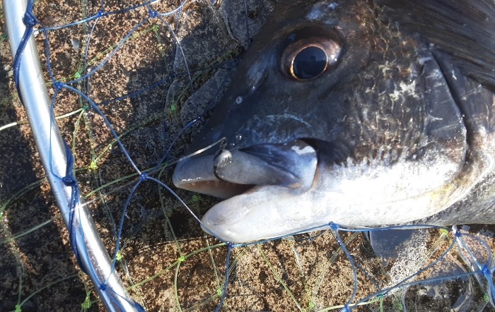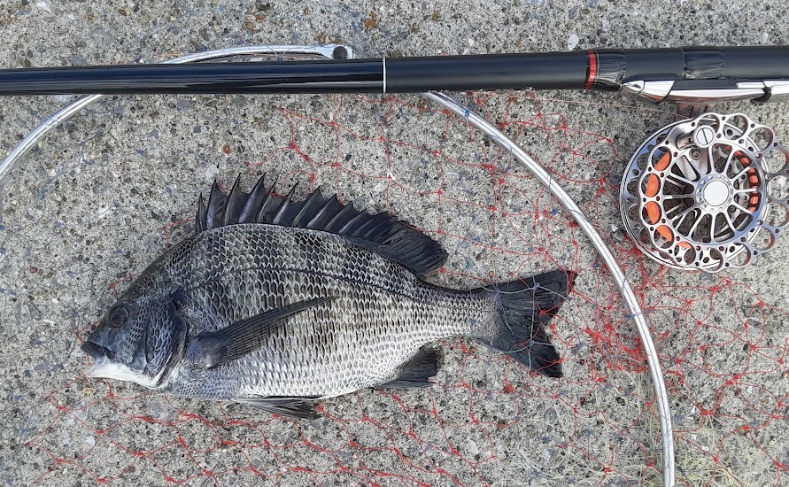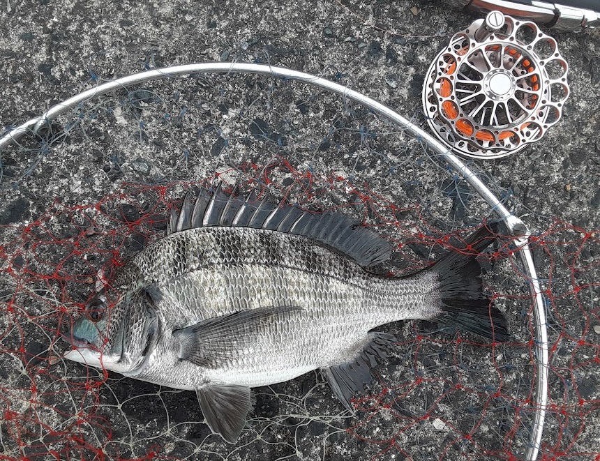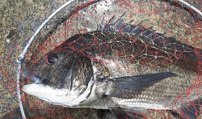 15:00 元の場所に戻る。最高のポイントである短波止はまだ叩いていない。ここで蟹餌にチェンジして叩いてみる。しばらくすると餌が何かに引っかかって止まっている感じ。聞いてみるも何の手ごたえもない。もう一度1メートルほど先に餌を投入して全集中。同じように途中で引っかかった感じになり優しく聞きながら合わせてみるとゆっくりと引き込む感じになりHIT。鈍いが重量感のある引き。内に潜ろうか沖目に逃げようか中途半端な動きをするもそれに合わせて対応する。しばらくして浮いてきたので空気を吸わせてタモを投入しGET。