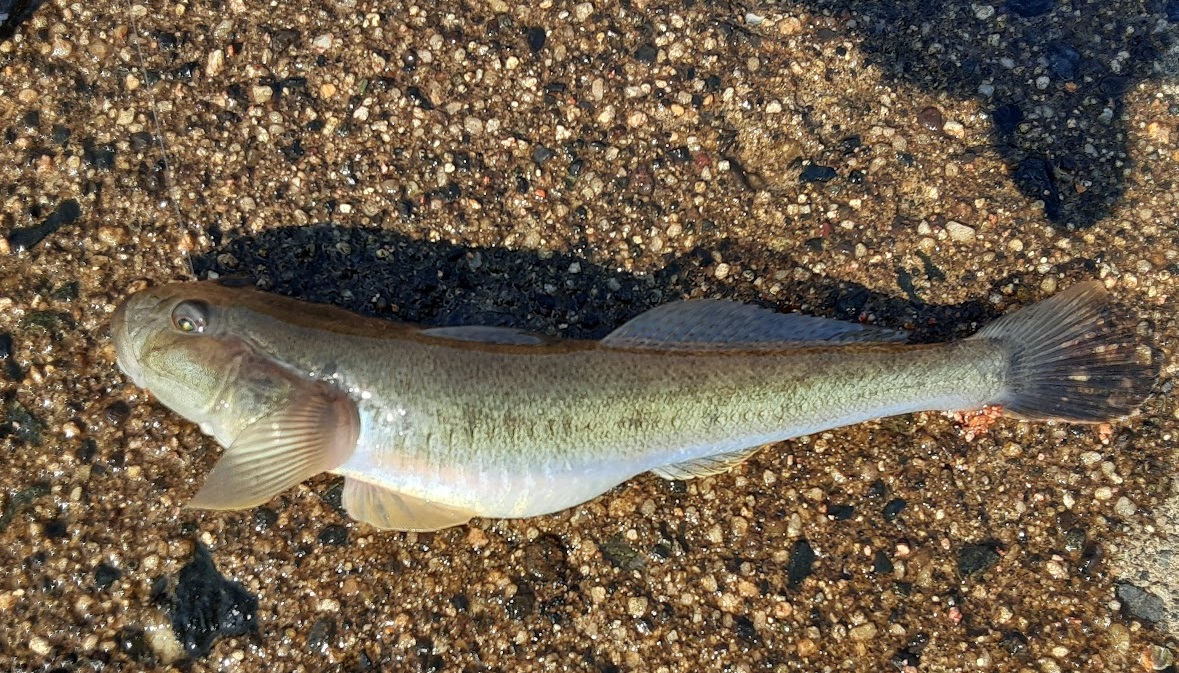 背鰭付近下の皮が見えないが,その部分にスレがかりでHIT。かなりの良型のマハゼ。尾鰭の形状がやはり違う。