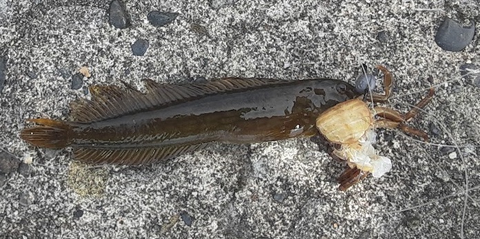 12:00 その後潮も引いてきて偶に蟹が取られる。また同じところで違和感があり合わせるもLOST。蟹がつぶされていたが上の甲羅がはがれていただけで,フッキングすらしなかったのでもう一度そのまま落としてみる。弱弱しいアタリがあり合わせると何かが付いていた。