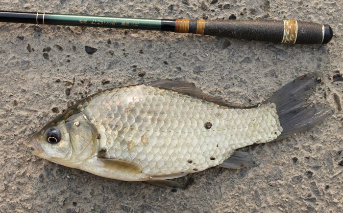 比較的浅場でHITし,とても小さなアタリだった。撒餌がここでは効果はあるかもしれないが,鯉鮒がやってくることがネックである。大きさの割に尾鰭の基部の部分が太いのがこの地域の鮒の特色ではないのかなと勝手に思っている。