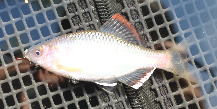 色は抜け気味。しかし,槍はあまり釣れず,オイカワや鮒,そして招かざる移入種の大型のワカタが釣れてくる。ワカタは型も大きく,逃げ回るので,場が荒らされてしまう。30㎝クラスの大型のワタカも釣れたので撮影しようとするも暴れまわり,たなご針も自分でハリスから折り逃げていく。迷惑極まりない。